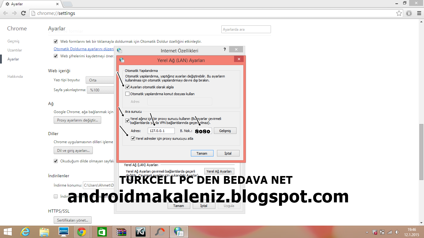 AYARLAR-GELİŞMİŞ AYARLAR-PROXY AYARLARINI DEĞİŞTİR ve resimdeki gibi yapın